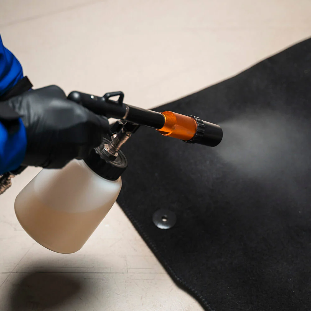 La pistola miscela aria compressa e detergente nel serbatoio generando un flusso vorticoso ad alta velocità (fino a ~5000 rpm) che solleva e stacca lo sporco in profondità. Così usi meno prodotto rispetto ai metodi tradizionali e arrivi facilmente in fessure, guide sedili e bocchette.