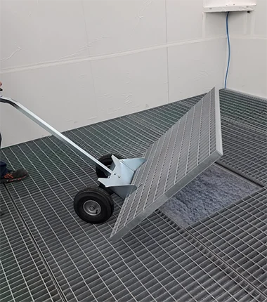 RAMPÌ – Carrello Solleva Griglie è un comodo e pratico carrello per la rimozione delle griglie nei pavimenti delle cabine di verniciatura e nelle aree di preparazione. Le grandi ruote gommate garantiscono uno spostamento agevole e senza problemi sulle griglie e su pavimenti irregolari.
